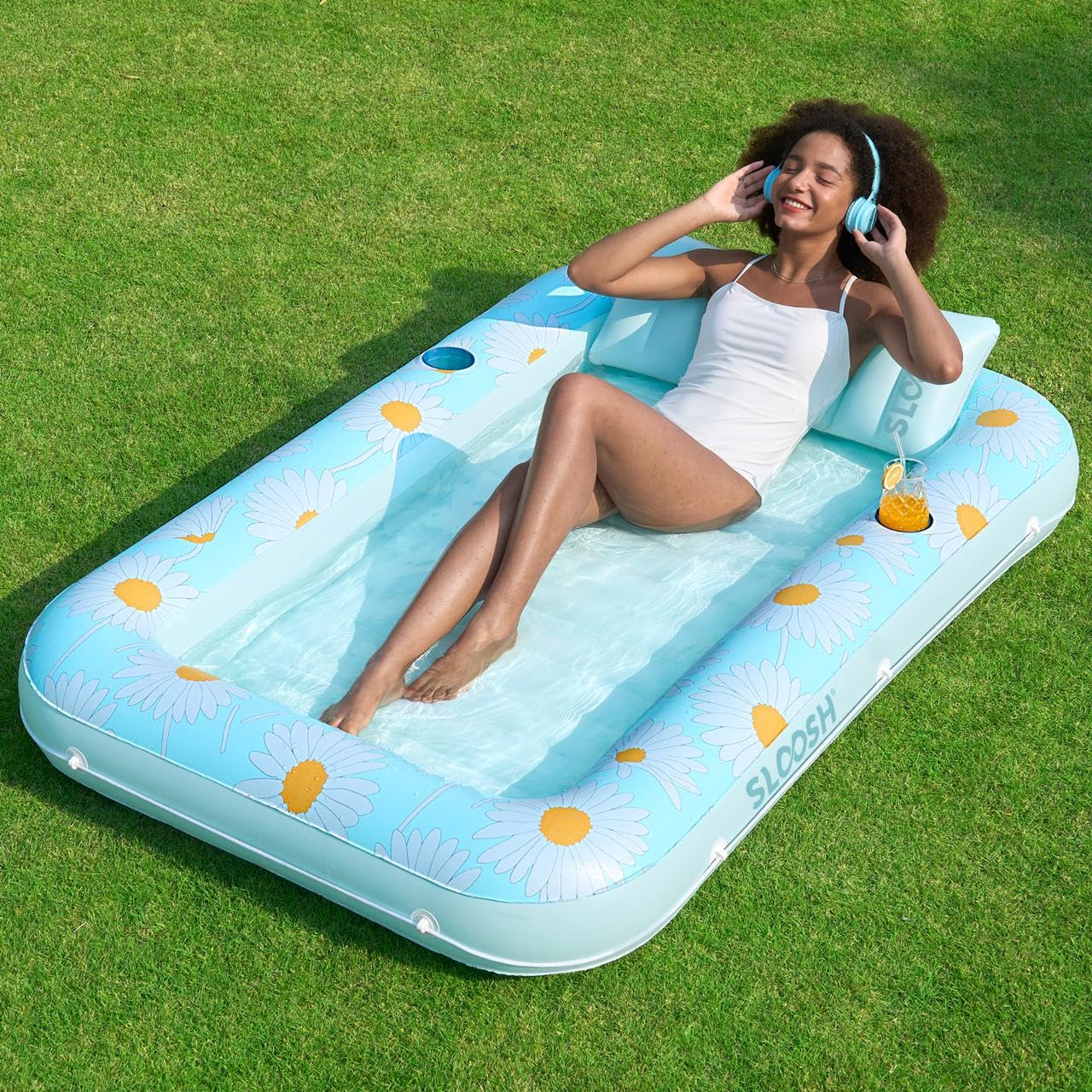 Inflatable Tanning Pool Lounger Float for Adults, 70" x 46" Blue Daisy, 2025 Designer Series